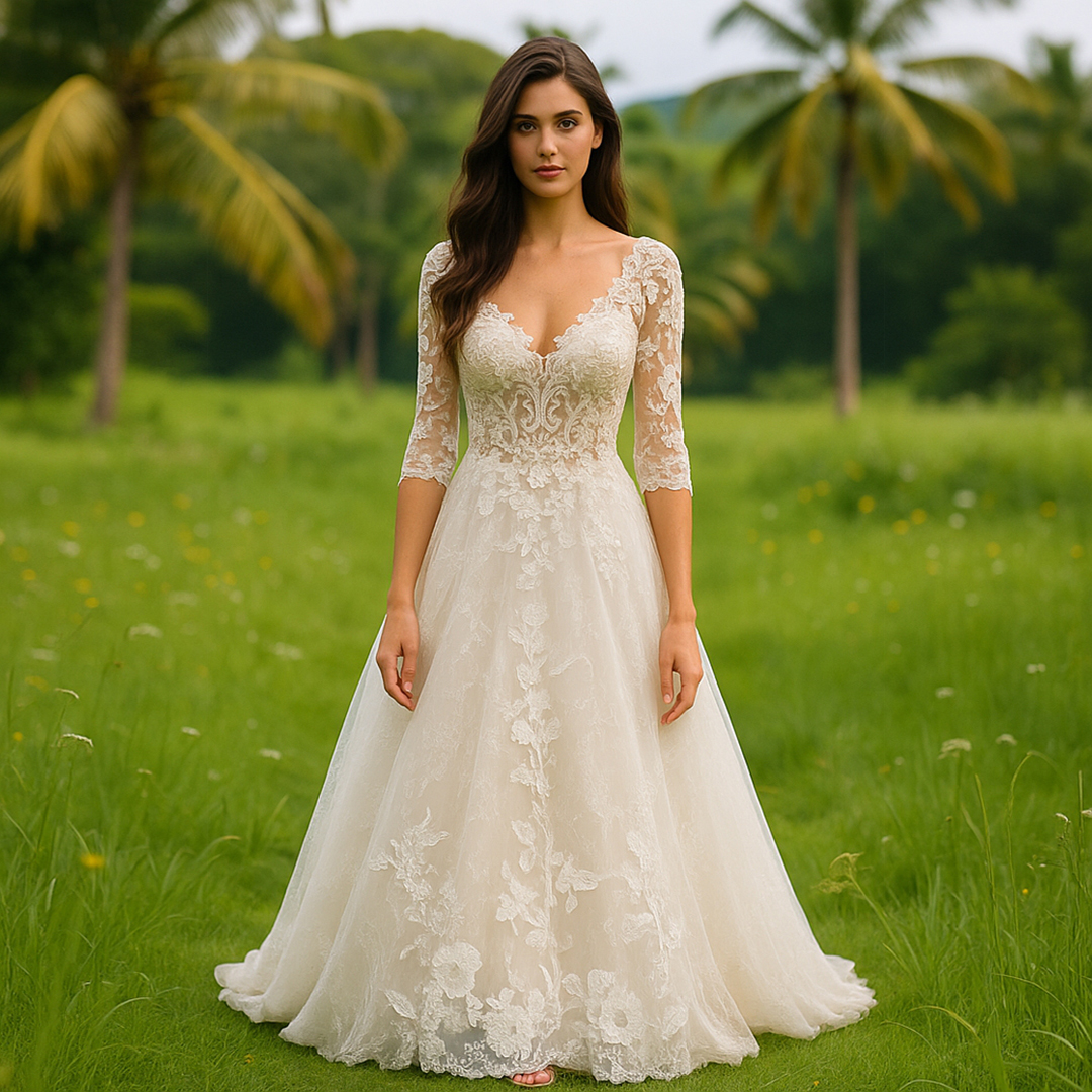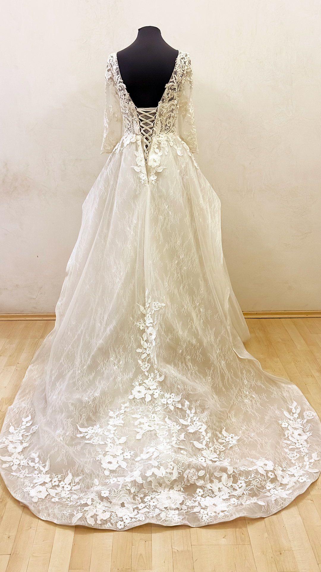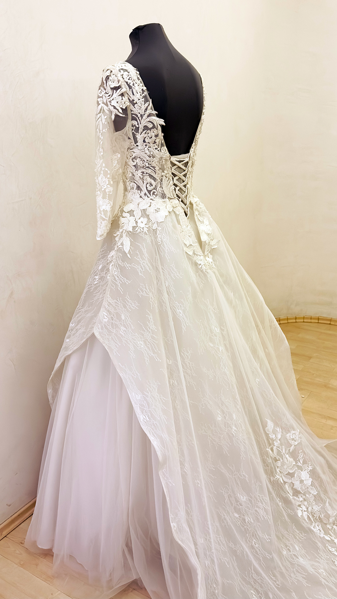 Hermoso vestido de novia de tul con aplicaciones de encaje.